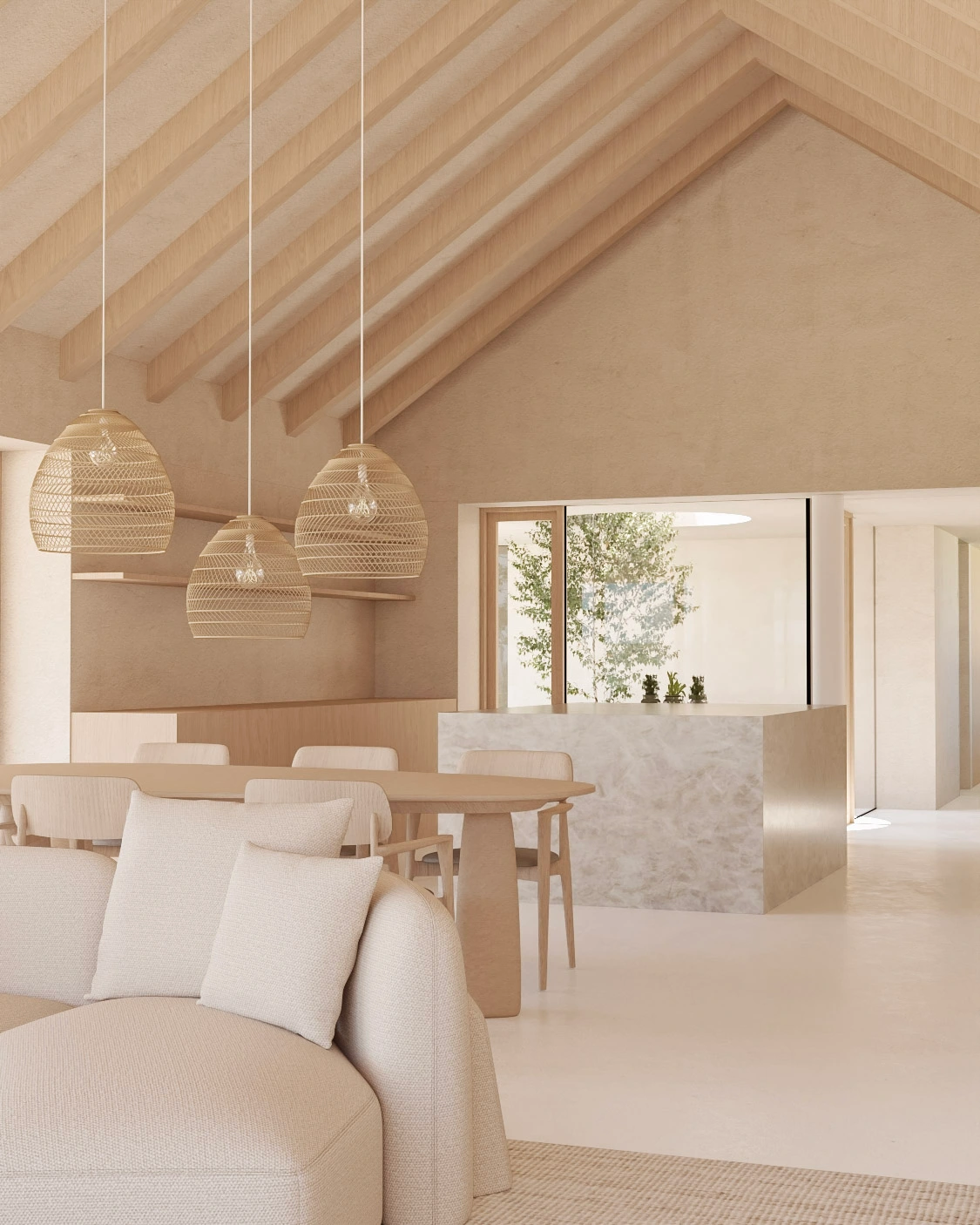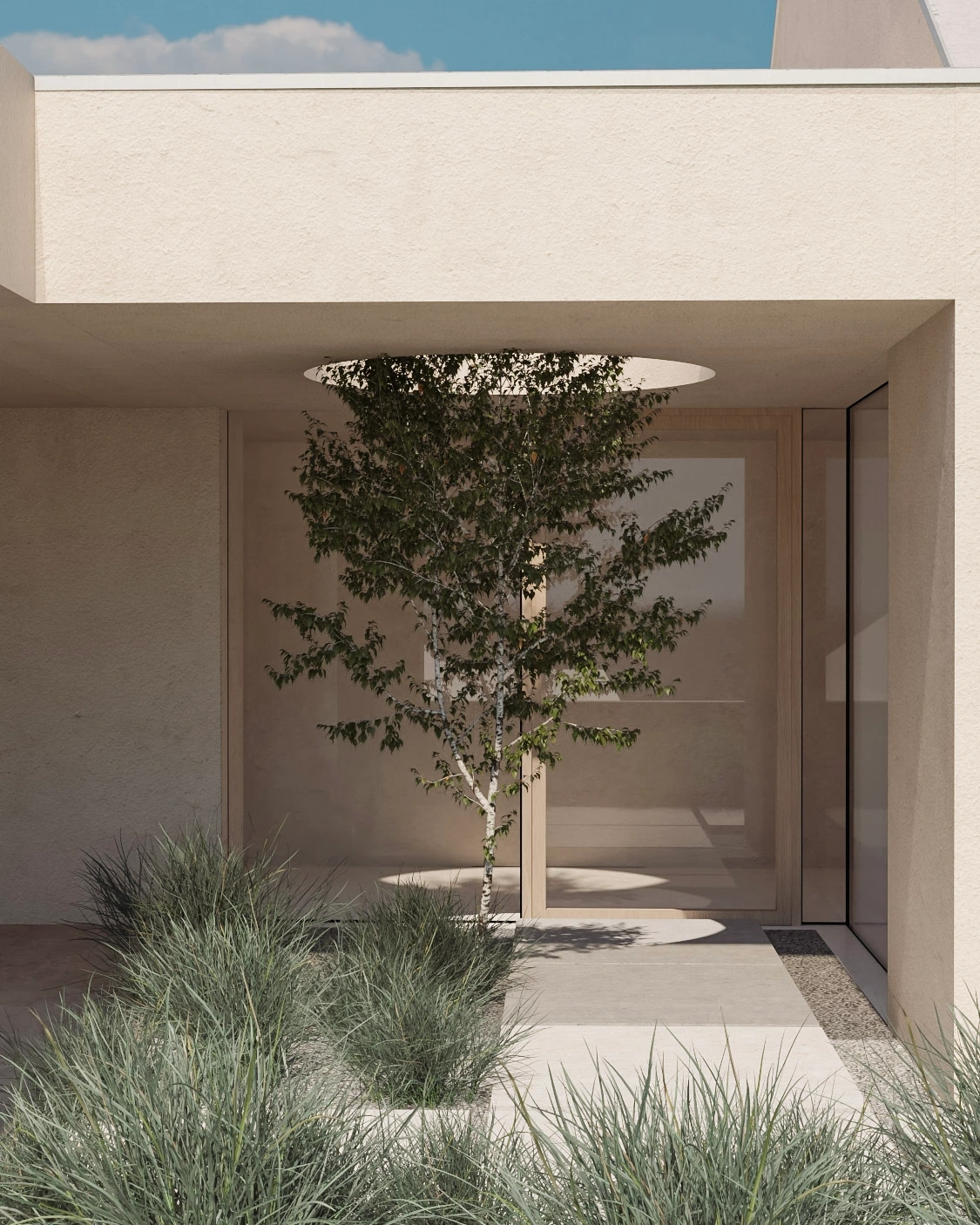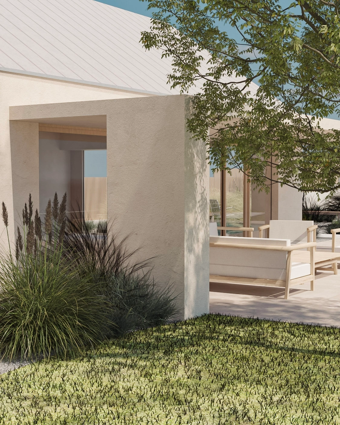 Architektonické řešení domu vytváří polouzavřený vnitřní dvůr, orientovaný do zahrady. Ten slouží jako intimní venkovní obytný prostor pro relaxaci i rodinné chvíle. Zároveň chrání interiér před pohledy z ulice a dodává domu atmosféru soukromí a bezpečí.
